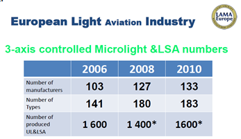 Regarding the US market, and having in mind that the LSA rules are effective since April 2005, as of 1st April 2011 there were 88 types of aircraft certified as Light Aircraft. From those 88 types, 49 have European origin (56%). This aircrafts were made by 64 different companies, from which 35 are European (55%). When talking about the total number of light aircrafts registered as of April 2011, the number is 2031. From those, 1284 (63%) were manufactured in Europe.