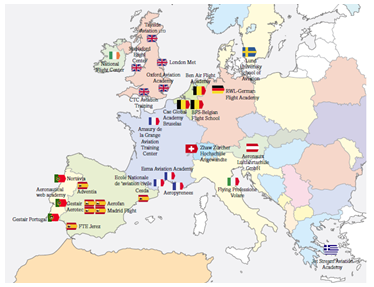 The most valued European flight schools are located in the following map.