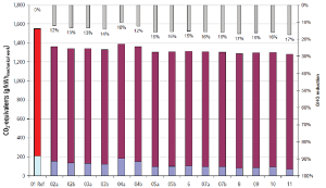 during the production of gasoline (leftmost column) and different bioetanols. The section of the column below cero represents the absorbed